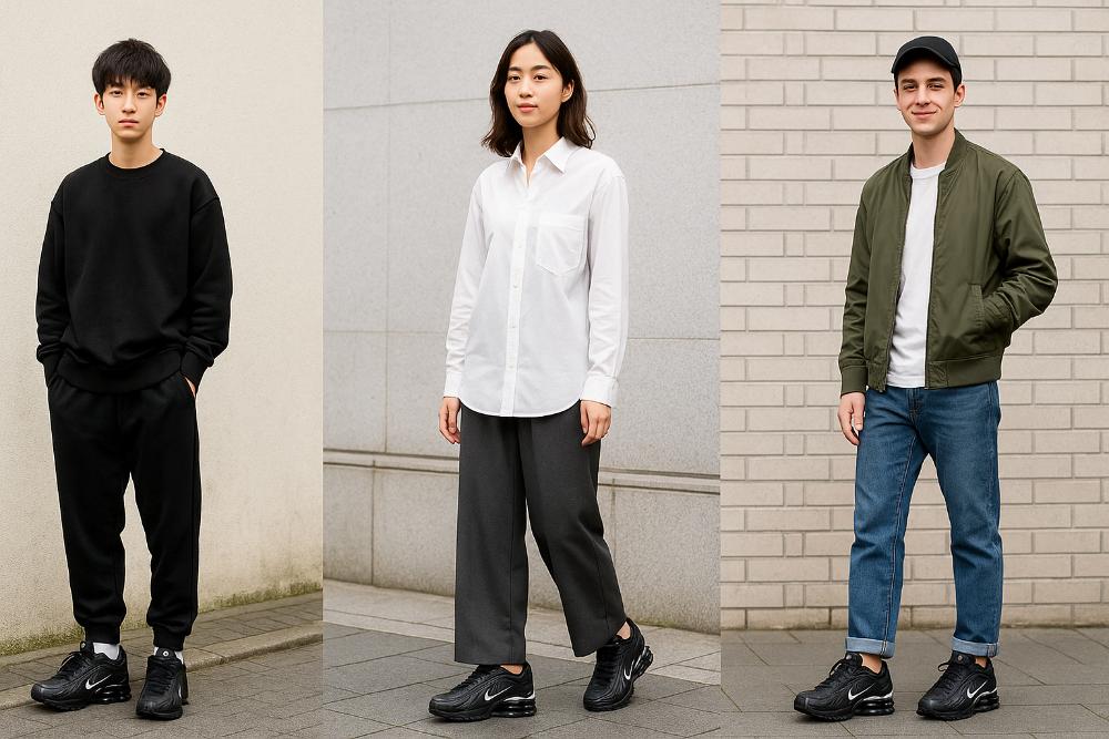 ショックスR4は、その近未来的なシルエットとボリューム感を活かすことで、さまざまなコーディネートに対応します。