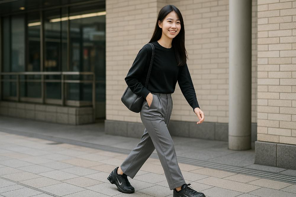 モノトーンコーデに取り入れることで、ショックスR4のメカニカルなデザインがアクセントになります。ブラックやグレーのワイドパンツ、無地シャツなど、全体をシンプルに構成するほど洗練された印象になります。